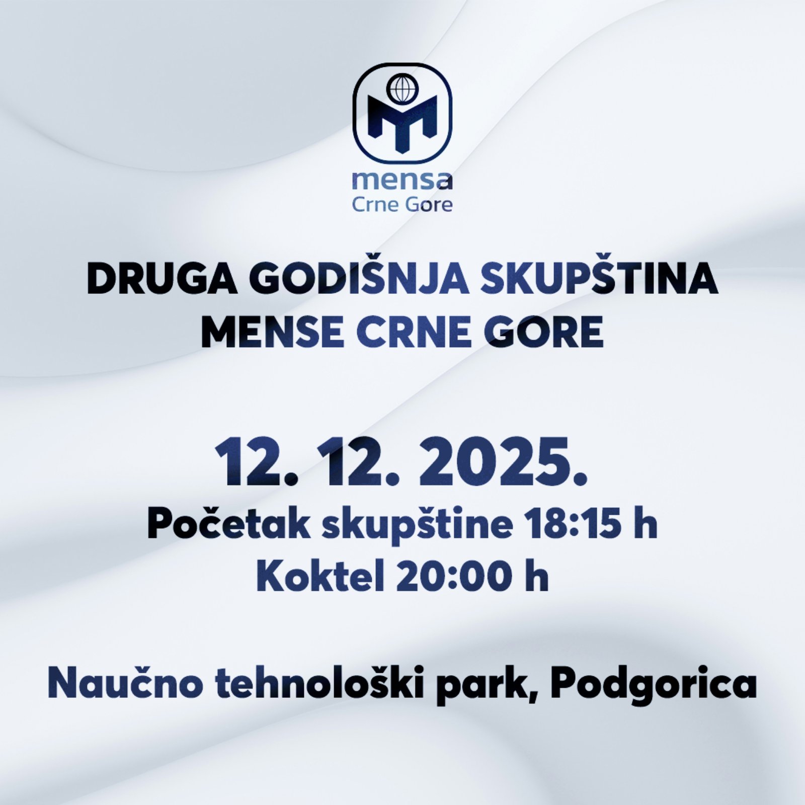 Druga redovna godišnja Skupština Mense Crne Gore će se održati u petak, 12. 12. 2025. godine, u Naučno-tehnološkom parku (NTP) Crne Gore, sa početkom u 18.30 časova.