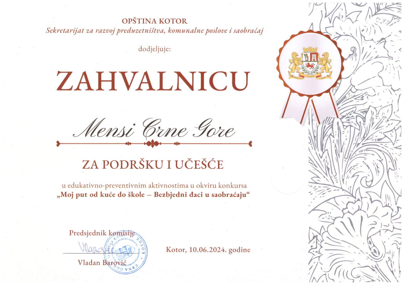 Sekretarijat za razvoj preduzetništva, komunalne poslove i saobraćaj Opštine Kotor kroz nagradni likovni konkurs „Moj put od kuće do škole – Bezbjedni đaci u saobraćaju“ dodijelio je deset bicikala kotorskim osnovcima. Mensa Crne Gore i Rotari klub Kotor su dodijelili i specijalnu nagradu, još jedno biciklo, za najbolji rad među svim školama. Likovni konkurs održan je u okviru kampanje „Bezbjedni đaci u saobraćaju“, koju Sekretarijat za razvoj preduzetništva, komunalne poslove i saobraćaj sprovodi s ciljem podizanja svijesti o značaju bezbjednosti saobraćaja, kao i edukacije djece o bezbjednom učešću u saobraćaju.