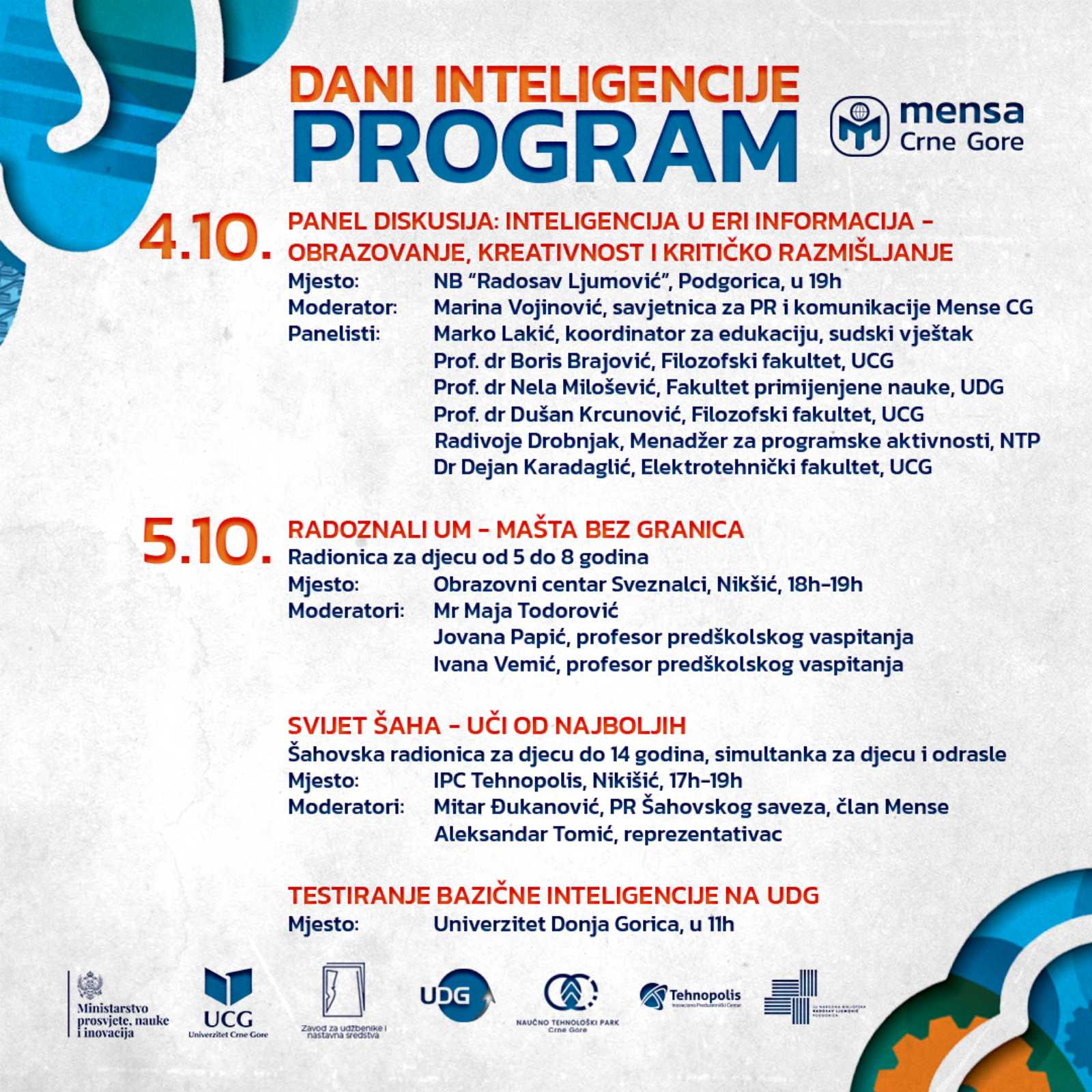 Mensa Crne Gore je, povodom obilježavanja 1. oktobra - Međunarodnog dana inteligencije, ove godine po prvi put organizivala manifestaciju „Dani inteligencije“ koja je održana od 1. do 5. oktobra 2024. godine. Ovaj događaj je okupio učesnike različitih uzrasta i interesovanja, u cilju promovisanja važnosti razvoja intelektualnih kapaciteta i inovativnog razmišljanja. Partneri u organizaciji su bili Ministarstvo prosvjete, nauke i inovacija, Univerzitet Crne Gore (UCG), Zavod za udžbenike i nastavna sredstva (ZUNS), Univerzitet Donja Gorica (UDG), Naučno-tehnološki park (NTP), IPC Tehnopolis i Narodna biblioteka „Radosav Ljumović“. Program je osmišljen kako bi podstakao razvoj kreativnosti, kritičkog mišljenja i intelektualnih potencijala kod djece i mladih, ali i da se podrže humani ciljevi poput prikupljanja knjiga za obrazovne ustanove. Događaj je bio otvoren za sve one koji žele da unaprijede svoje znanje i sposobnosti u oblastima inteligencije, nauke i tehnologije. Pregled programa i više detalja o pojedinačnim dogadjajima pročitajte u nastavku.