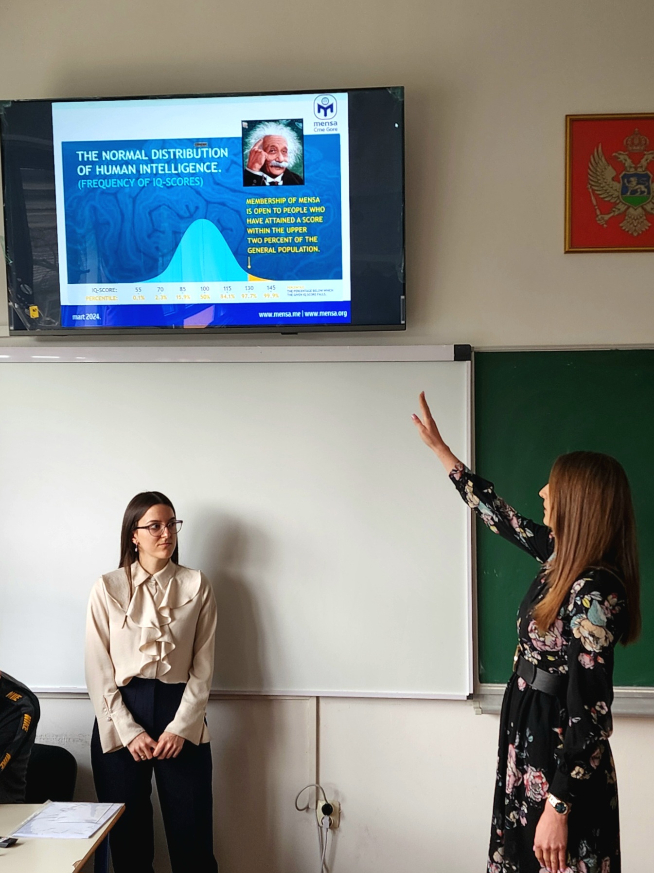Radionica je održana 27. marta na času Ustavnog uređenja Crne Gore, u odjeljenju I10, kod prof. Gordane Kavarić. Radionicu pod nazivom “Upoznajte Mensu Crne Gore: Više od testiranja bazične inteligencije” su realizovale predstavnice i članice Mense Dragana Pantović Nikčević i Marija Uskoković.
